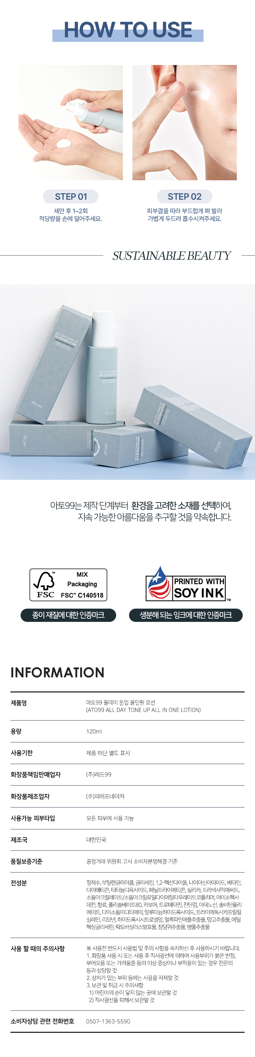 【ATO99】All Day Tone Up All In One Lotion 120ml 韓國直送|2週左右到貨 ✨ 一瓶搞定保濕、美白、修護、提亮 ✨ 從早到晚,素顏也能自帶光芒 💫 💧 保濕力滿分:甘油、丁二醇、甜菜鹼 🌟 亮白提亮:煙酰胺+傳明酸+腺苷 🌿 舒緩修護:積雪草、當歸、乳酸菌發酵精華 🍍 天然果萃:菠蘿+芒果,清爽不黏膩 🛡️ 柔焦防護:二氧化鈦+矽成分,打造柔霧肌感 不只是乳液,更是你的日常肌膚守護者 💖